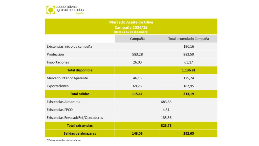 Las salidas de aceite al mercado se situarían en el mes de diciembre en el entorno de las 115.410 t., superiores en 19.170 toneladas al mes de diciembre de la campaña pasada. Las salidas acumuladas en este tercer mes de campaña son de 313.190 t.