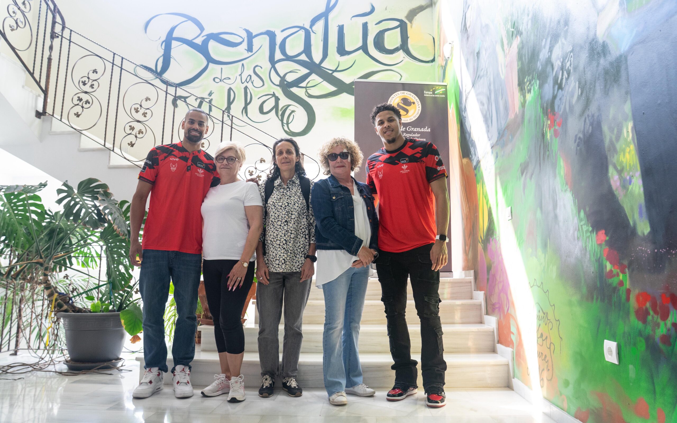 Jugadores del Fundación CB Granada (Covirán Granada) han visitado la sede de la Denominación de Origen Montes de Granada, que se encuentra en las dependencias municipales de Benalúa de las Villas, acompañados por la secretaria de la DOP Montes de Granada, Marta Gallego.
