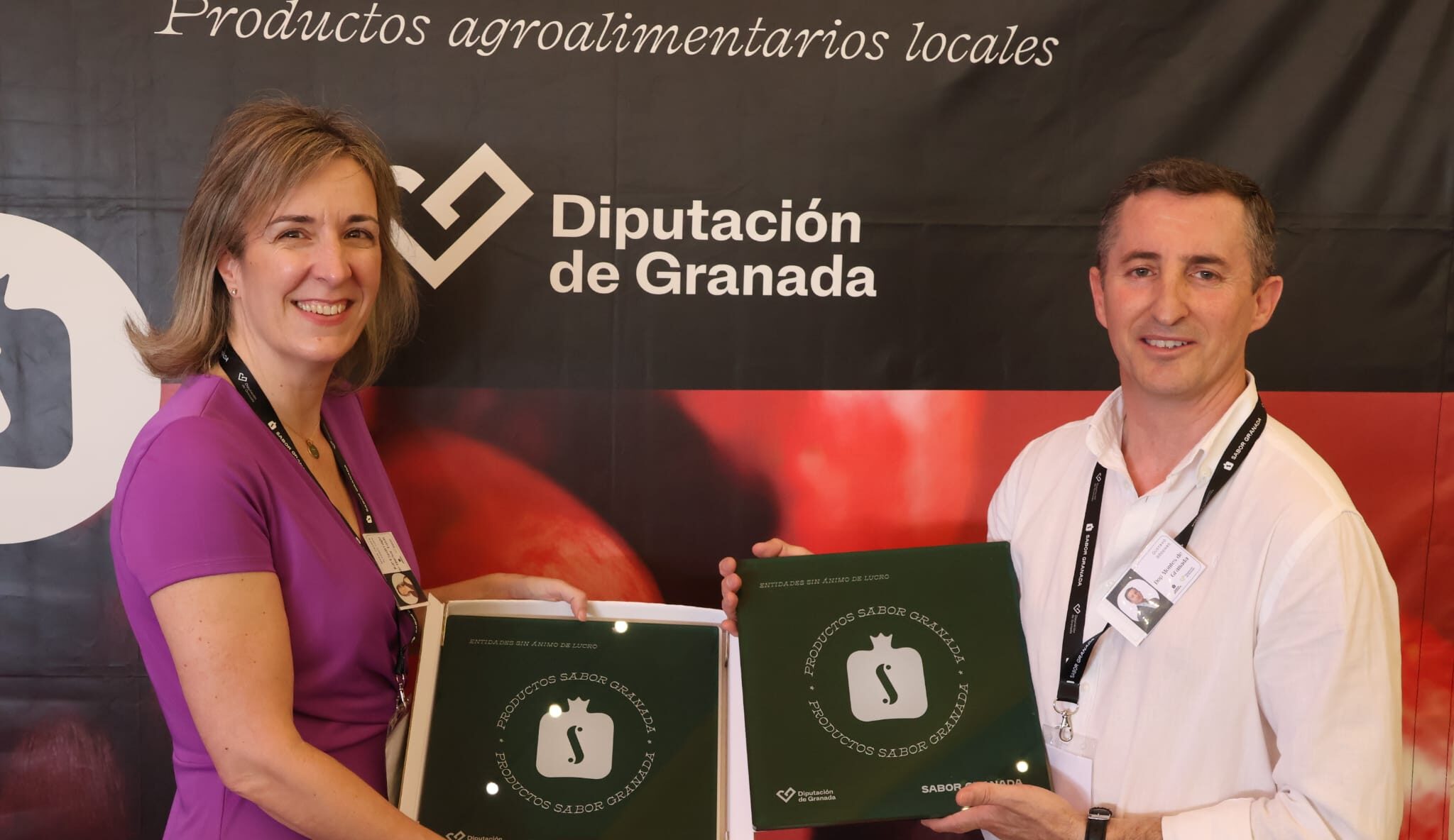 El presidente de la DOP Montes de Granada, Gustavo Ródenas, y la presidenta de la IGP Espárrago de Huétor Tájar, María del Carmen Álvarez, han recibido la placa de reconocimiento como integrantes de la marca de productos agroalimentarios de la Diputación de Granada, Sabor Granada. El acto ha tenido lugar en la caseta de la Diputación de la Feria del Corpus de Granada, con la presencia del diputado de Fondos Europeos y Desarrollo, Antonio Díaz.